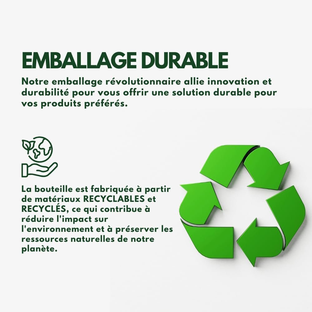 Emballage durable : notre emballage révolutionnaire combine innovation et durabilité pour vous offrir une solution écologique pour vos produits de beauté préférés. Le flacon est fabriqué à 100 % avec des matériaux recyclables et recyclés, ce qui contribue à réduire l’impact environnemental et à préserver les ressources naturelles de notre planète.