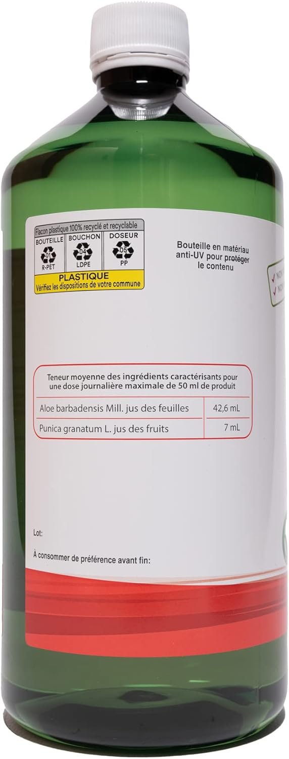 Jus et pulpe d’Aloe Vera (Aloe Barbadensis Miller, gelum sine cute) 95%, jus de grenade (Punica granatum L.) concentré fruits 4,8%; Conservateurs: sorbate de potassium, benzoate de sodium; Acidifiant: acide citrique; Antioxydant: acide ascorbique
